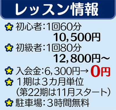 特別体験レッスンは10月21日、28日の日曜日に開催。両日11時40分〜12時50分と19時50分〜21時の2回実施。費用は1050円で予約制。また、通常レッスンでの体験は随時行っており、問合せれば個別に対応してくれる。