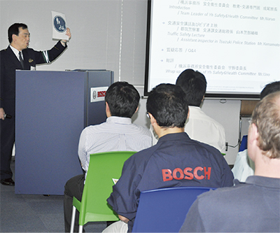 自動車部品や電動工具などを手がけるボッシュ株式会社(牛久保3の9の1)で5月13日、都筑警察署交通課による交通安全教育が行われた。