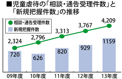 市内の児童相談所が2013年度に把握した児童虐待件数は1159件(前年度比25%増)で、過去最多だった。相談・通告の受理件数も過去最多を記録しており、前年度比442件増の4209件。こども青少年局中央児童相談所では啓発活動や関係機関との連携により察知体制が強化されたことを増加の一因にあげ、早期発見につながったとしている。内訳は「心理的虐待」が約5割を占め、「身体的」、「ネグレクト」、「性的」と続く。これまで「心理的」は「身体的」を上回ったことはなかったが、今年度は父母のDV現場にいた警察から「子どもが様子を見ている」などという通告の増加が要因にあげられる。