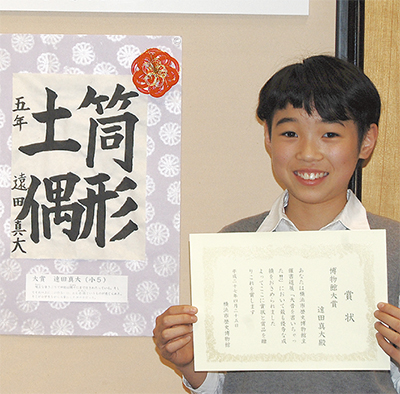 市歴史博物館(都筑区中川中央)で4月25日、書道展「大昔を書いちゃった!!」の授賞式が行われ、金沢区在住の遠田真大(えんだまひろ)さん(11)が最優秀の博物館大賞を受賞した。