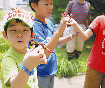 都筑中央公園(茅ケ崎中央57の8)で6月20日、NPO法人都筑里山倶楽部(井上晴彦事務局長)主催の「里山杯ザリガニ釣り大会」が行われ、約100人が参加した。