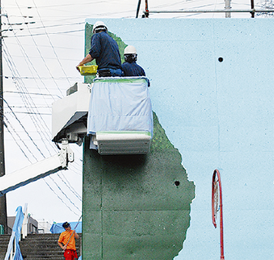 9月初旬から壁画制作を始め、清掃や下塗りを実施。落書きを消してから絵の下描き作業を進めた。19日には、水性ペンキで色塗りを開始。川和小や川和東小の児童、同中学校の生徒、ボランティアなど約50人が参加し巨大擁壁に絵を描いた。また、川和中親児の会の協力を得て、高所作業車でも作業を行った。