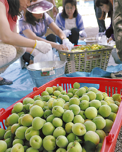 また、敷地内にある町内会館で、もぎたての梅の実を使用した梅酒作りも行われた。この日仕込んだ梅酒を来年2月頃に開催する観梅会で振る舞う予定だ。