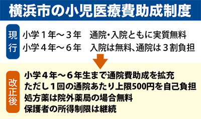 現行の横浜市の制度では患者負担分を市や県が負担することで、0歳から小学3年生までは通院・入院ともに実質無料、小学4年から6年生までは入院費は無料だが、通院費は大人と同じ3割負担となっている。