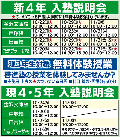 横浜市内で4教室を展開する『啓進塾』が、新小学4年生対象の入塾説明会を開催する=表参照。現役講師が、塾の目指す「学び」について丁寧に説明する。