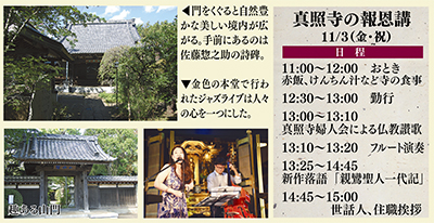 浄土真宗では、宗祖である親鸞聖人の遺した教えを偲ぶ集いを「報恩講」という。真照寺は誰でも参詣できる催しとして例年11月3日(祝)に行い、毎年約150人が足を運ぶ。例年の法話に代えて、今年は落語家・三遊亭右左喜(うさぎ)さんが新作落語「親鸞聖人一代記」を口演する。雲井住職は「年に一度の大切な行事。多くの方に来ていただき、お話を通して仏教に親しんでいただければ」と話す。