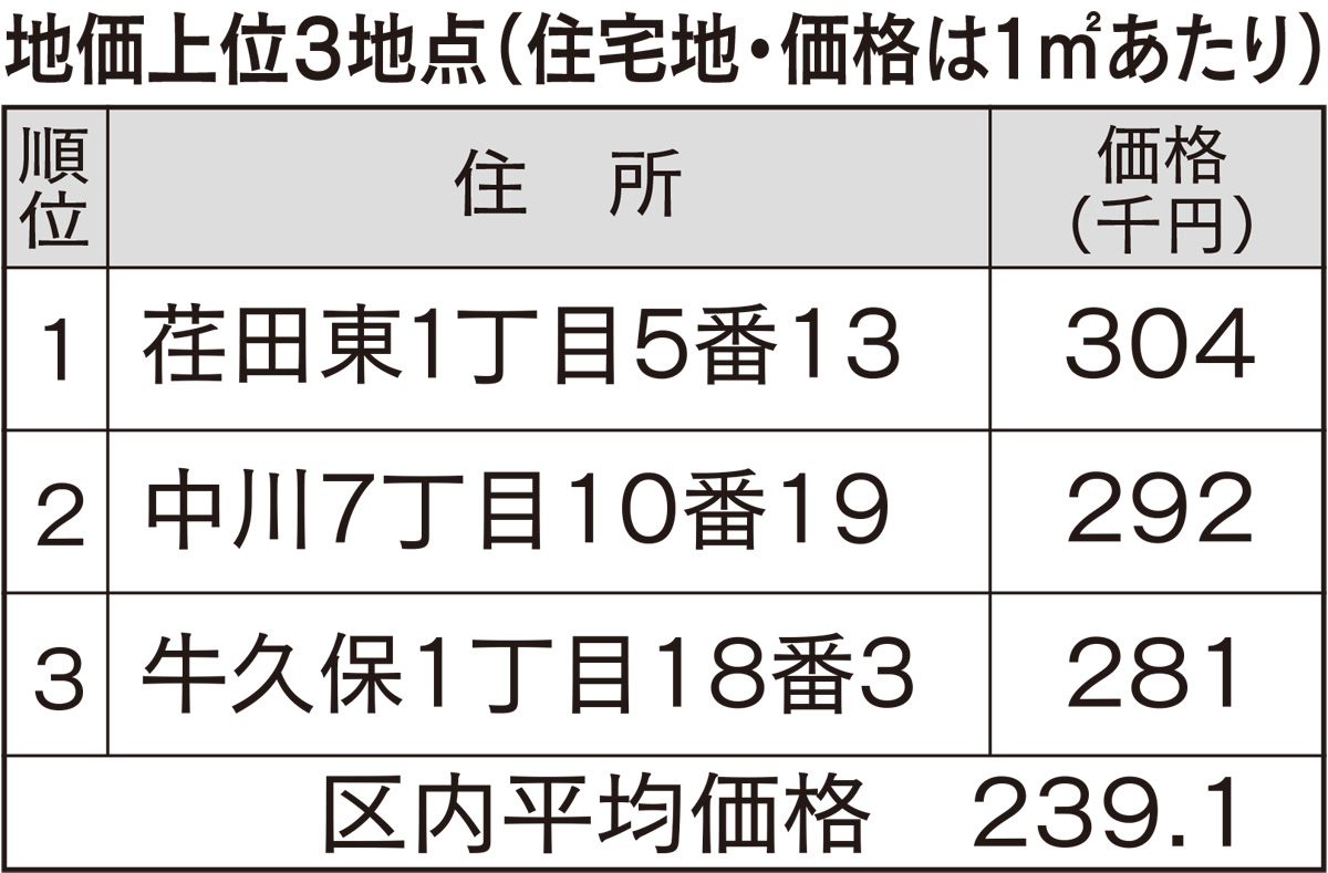 区内1平方メートルあたりの平均土地価格は23万9100円。中でも30万4000円と最も高かったのは、センター南駅周辺の商業施設や区役所などから近い「荏田東1丁目5番13」で変動率は2・0%だった。次いで、センター北駅付近の「中川7丁目10番19」が29万2000円で1・7%、「牛久保1丁目18番3」が28万1000円で1・8%と続き、変動率も上昇した。変動率が最も高かったのは、南山田小学校近くの「南山田2丁目28番40」で2・3%となった。