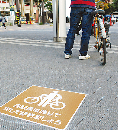 センター南駅前の路面標示を見た自転車利用者は「表示があると安全性が高まる」と話す一方で、「運転中は足元が見えづらく、気づかない人もいるのでは」と懸念を示した。今年1月から10月の間に区内で発生した人身交通事故は575件。うち自転車に関わる事故は113件で、駅周辺では40件発生している。人通りの多い駅周辺で事故が多発する傾向にあるとみられる。土木事務所の平山実所長は「これまでと環境が変わり戸惑うかもしれないが、安全教室などを開き周知していく。区民の皆様の安心安全のため、互いに思いやりを持って通行してほしい」と話している。