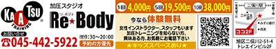 健康的にダイエットしたい、いつまでも若々しくいたい、自分の体力を維持させたい…。そんな方におススメしたいのが、二俣川駅南口歩いてすぐの「加圧スタジオ Re★Body(リ・ボディ)」だ。同スタジオでは、「加圧トレーニング」を用いて、ダイエットや体力向上などをサポートしてくれる。