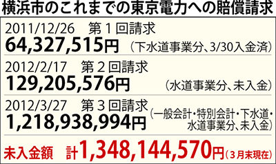 この質問を契機として、賠償請求の問題が議会や委員会で数度取り上げられました。その後、東京電力に対して横浜市から3回の請求が行われ、今年3月30日に第1回請求金額分(下水道事業分・昨年12月26日請求)の約6400万円が東京電力から横浜市に入金されました。