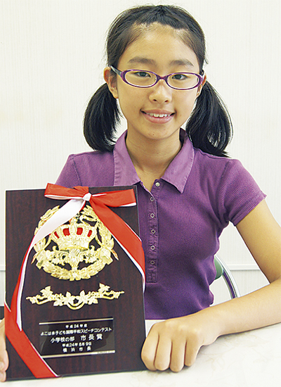 市立不動丸小学校6年生の大根田絢乃(おおねだあやの)さんが8月9日、10日に開催された「よこはま子ども国際平和スピーチコンテスト」本選に出場し、市長賞を受賞した。スピーチでは東日本大震災後に感じた「世界のつながり」を訴えた。