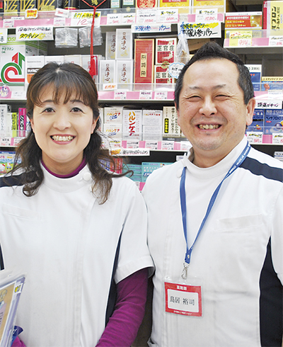 「形態はドラッグストアだけど、相談薬局みたいなものです」と鳥居店長。近隣だけでなく、市外から訪れる人もいるのだとか。話を聞いている最中にも、薬に関する問い合わせの電話が。「一人ひとりに合わせたカウンセリングを行い、健康で元気の仲間入りをお手伝いします」。詳細、問い合わせは左記へ。