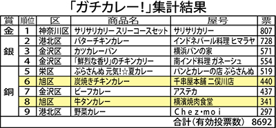 旭区からは5店が参加する中、千串屋本舗・二俣川店の「炭焼きチキンカレー」が6位(440票)、横濱焼肉食堂の「牛タンカレー」が8位(341票)と、入賞を果たした。