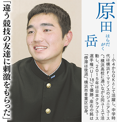 原田「とても尊敬しているGKと、1年の時に国体の県選抜に選ばれたんです。初戦で怪我をしたその選手の代わりに2回戦から出て、決勝は結局出られなかった。屈辱というか、そこから強くなろう、超えてやろうと強く思いました。日々の中で他選手との違いを見せようと、誰より早く練習場に行ったり…。3年の初め、ある日『自分一本でいく』と言われた時に少し変われたなって」