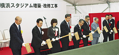 来年開業40年を迎える横浜スタジアムで先月25日、同球場の増築・改修工事の起工式が行われ、横浜DeNAベイスターズの南場智子オーナーや岡村信悟社長のほか、工事や行政の関係者、市会・県議会の議員らが集まった。