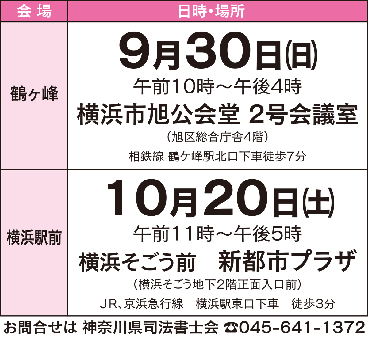 県内の司法書士と司法書士法人が所属する「神奈川県司法書士会」(星野務会長)は10月1日の法の日を記念して各地で「無料法律相談会」を開催。司法書士が相続や遺言、成年後見、労働トラブル、借金、会社や土地・家屋の問題など業務範囲内の様々な悩みに応じる。詳細は県司法書士会へ。