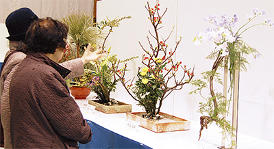 当日は、区内で活動する華道各流派の会員らによる作品100点が並び、会場を鮮やかに彩った。来場者は、可憐な作品や豪華な大作など、さまざまな表情を持つ作品一つひとつを丁寧に見て回っていた。