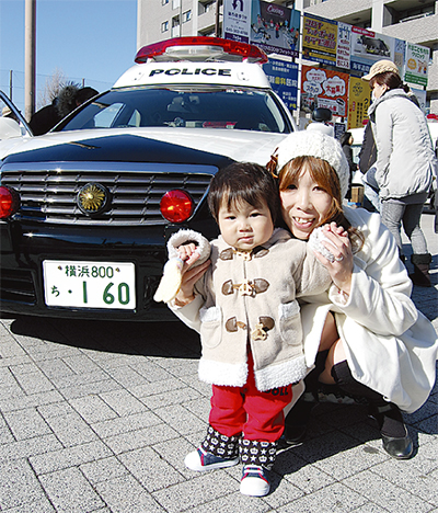 パトカーや白バイの乗車体験も行われ、多くの家族が来場。子どもたちが保護者とともに運転席に座ってハンドルを握り、目を輝かせて憧れのパトカーを運転する気分を体験していた。