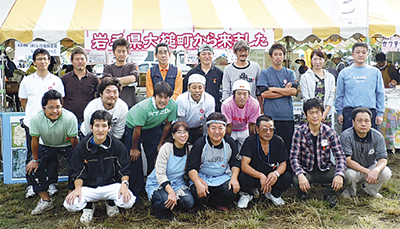 当日は、大槌から運んできた南部鼻曲がり鮭を使ったアラ汁と現地直送のはらこ飯(いくら丼)、ゆいっこ瀬谷支部自慢のホルモン焼きなどを提供。さらに、大槌町の被災者が作成した布ぞうり、マフラー、コースターなどのグッズの販売も。はらこ飯は「いくらかけ放題」の大盤振る舞いで20分で即完売。ブースにはたくさんの訪問者で賑わい「がんばってね」「私も岩手県出身。がんばろうね!」とあたたかい声がかけられていた。