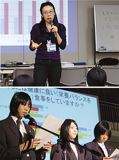同校は、食育の推進を強化。10月27日の同校の文化祭では保健委員会の生徒が、全校生徒の前で食育の発表をした。生徒への食事のアンケート調査や、小西さんのアドバイスなどをもとに、日本人に合った食生活を紹介。栄養の知識を話すだけでなく、「料理を手伝うと五感を使うので、脳に良い」、「自分で作ったり、メニューをリクエストすることで、家族も健康になれる」と効果と実践方法を提案した。