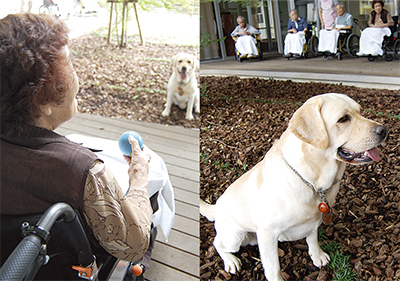 同所で行われているドッグセラピーはAAA(動物介在活動)と呼ばれているもので、動物と触れ合うことで情緒的な安定を目指すというもの。犬の姿を見て、触れながら日光浴をし、施設での生活の大きな楽しみになっている。
