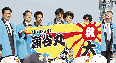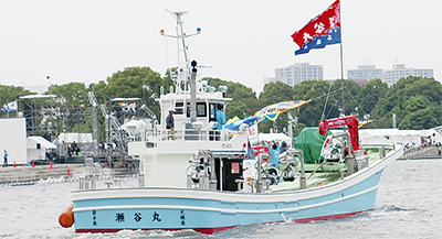 「三陸沖に瀬谷丸を!」実行委員会(露木晴雄会長)は8、9日に開かれた横浜開港祭で岩手県・大槌町の碇川豊町長らを迎え、本物を模した大漁旗の贈呈や出港式を行った。瀬谷丸が大槌での漁を始めるのはもうすぐだ。
