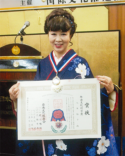 永年にわたり専門分野における国際文化の振興と向上に多大なる功績を収めた人に贈られる日本文化振興会(伏見博明総裁)の「社会文化功労賞」。このほど瀬谷区阿久和の八木裕子音楽事務所所属演歌歌手、八木裕子さんが同賞を受賞。同会本部で賞状とメダルの贈呈式が行われた。