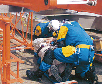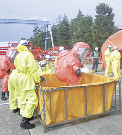 訓練は県内を震源地とした大地震が発生、多数の建物が倒壊し、被災者がクレーン車の下敷きになった想定で行われた。現場ではまず災害救助犬による捜索活動が。救助犬が生存者を確認すると、すぐさま瀬谷警察署(遠藤修治署長)から依頼を受けた瀬谷安全運転管理者会(川口恭正会長)ががれきの除去作業を開始。その後、県警本部危機管理対策課即応対策チームや第二機動隊による救出活動、瀬谷消防署(大山潔署長)による応急救護処置が行われた。また、化学薬品工場内で有毒ガスが発生した想定で、消防署特別救助隊による除染活動や救助訓練も実施された。