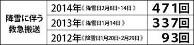 降雪のたびに影響を受ける都市生活。横浜市では昨年2回の大雪に関する救急搬送が471回を数え、そのうち2人は「降雪に伴う転倒」「除雪作業中に心肺停止状態」で重篤となっている。消防局担当者は「雪が降った日はもちろん、翌日以降の凍結による搬送も多いです。滑りにくい靴を履き、ゆっくりと歩くように」と注意を喚起する。