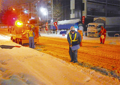 雪国ではない横浜市でも、例年1、2回、降雪に備えた出動態勢が取られている。実際に除雪作業が必要になった場合は、準備をしていた各区土木事務所職員と、市と災害時の協定を結ぶ横浜建設業協会(土志田領司会長)加盟業者の社員らがスコップによる手作業やショベルカーなどの重機を用いて道路の雪かきなどを行い、交通の確保に努めている。