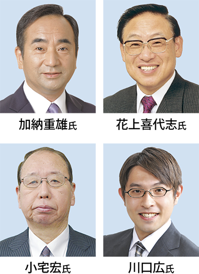 民主党の花上喜代志氏(68歳/9期)と公明党の加納重雄氏(62歳/4期)の現職2人は早々に立候補を表明、連続当選を狙う。新人は現任期で引退する自民党の川口正寿氏の後継として挑戦する川口広氏(34歳)と、元かながわ生協職員で共産党の小宅宏氏(63歳)が名乗りを上げている。