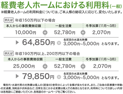 市の補助金を受ける公の施設なので、年収150万円以下の人なら、月に6万円台で生活することが可能(表参照)。入居金や一時金は一切不要。料金にはもちろん、栄養バランスに配慮された1日3食の食事や大浴場等での入浴費も入っている。施設によって様ざまなクラブ・サークル活動や季節ごとのイベントもあり、充実した生活を送ることができる。