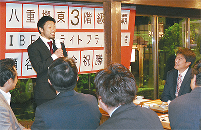 昨年末、世界ボクシング3階級制覇を成し遂げた、IBF世界ライトフライ級王者・八重樫東選手(32)の活躍を祝おうと1月16日、猪之鼻庭=泉区新橋町=で祝賀会が開かれた。