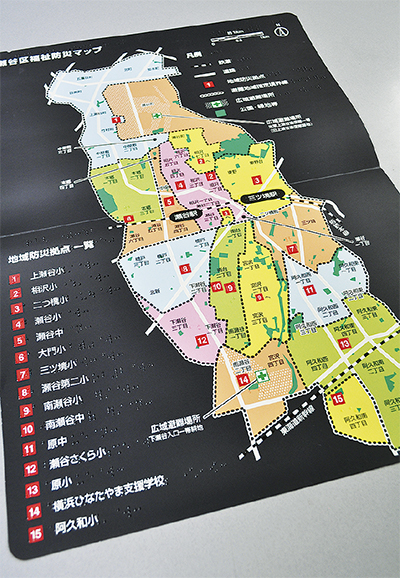 大災害が起きた時の避難行動の一助になればと、瀬谷区が視覚障がい者向け福祉防災マップを制作した。触れることで内容を把握できる「触地図」で、防災拠点などが点字や凹凸で示されている。区障害者支援担当によると、横浜市の区で初の取り組み。