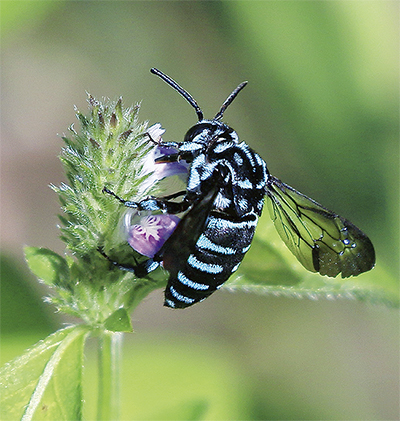 目を引く青い縞模様が特徴の「ナミルリモンハナバチ」が9月3日、阿久和西の貉窪(むじなくぼ)公園で発見された。「幸せを呼ぶ青いハチ」などとも呼ばれており、「いきものたちの谷戸観察会」メンバーで発見者の中村多加夫さんによると、「瀬谷区で見かけたのは初めてなのでは」という。