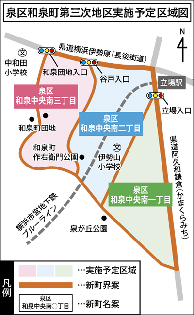 新町名は昨年夏に実施したアンケートに基づき、泉区和泉町住居表示検討委員会で決定。長後街道で南北に区切るために分かりやすいというのが理由だ。