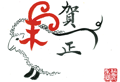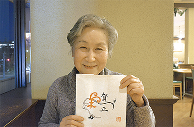 年賀状用に、毎年干支にちなんだ作品を作る山崎さん。今回の作品は、平仮名で書いた「ひつじ」に尻尾を付けるなど変形させて「羊」に見立てたものや、七福神が乗る宝物を積み込んだ帆船「宝船」の作品。お金の堤袋や松竹梅の絵を添えて、「お世話になっている方々に、いいことが舞い込む一年になればと願って書いたもの」と思いを話す。
