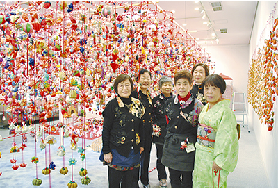 同所での作品展は今年で3回目。10人のメンバーたちが日々コツコツと作りためてきたものを展示しているため、その数は年々増えており、同会メンバーたちも数えきれない規模。およそ108平方メートルの会場は、着物や帯を使った色彩豊かな飾りでいっぱいだ。今年の干支である羊をモチーフにしたかわいらしい作品も並ぶ。