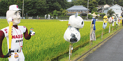 収穫を前にした田んぼをずらりと並んだかかしが守る姿はそれだけで迫力満点。細部まで凝ったつくりも面白い。コンテストの投票期間は9月18日まで。問い合せは公園事務局【電話】045・804・5133。