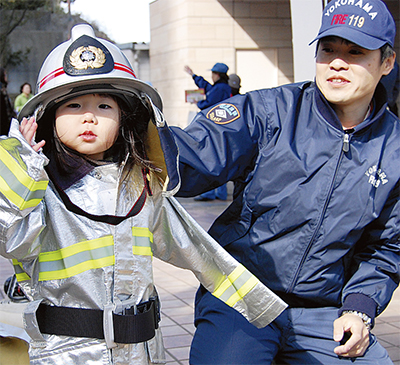 消防音楽隊による「トイレの神様」などの演奏のほか、女性隊員のドリルチーム「ポートエンジェルス119」によるステージも。子ども用の防火衣が試着できるコーナーや同警報器の相談コーナーも設置され、特に防火衣試着コーナーには多くの親子連れが訪れ、写真撮影をする姿が見られた。母親と来ていた宮澤知穂(ちほ)ちゃん(2)(上品濃)も防火衣姿で敬礼(=写真)。