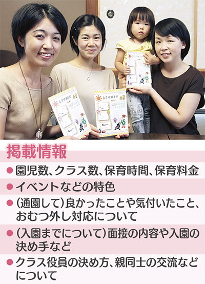 同団体は小さな子どもを持つ母親7人から構成。うち山田顕子(あきこ)さん(31)を中心に、1園につき最低3人の利用者に取材、4カ月かけて作った。「幼稚園に関する情報が掲載された冊子はほかにもあるが、利用者の感想を載せたものは珍しいのでは」と代表の森祐美子さん(30)。山田さんは「幼稚園から提供されない情報を多く盛り込んだ」、鶴嶋敬子さん(35)は「周囲の評価も高い」と出来に胸を張る。掲載する際は幼稚園にも内容を確認してもらい、掲載したい情報について交渉もしたという。