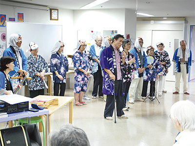 9月3日、121回目の慰問となったこの日は会員らが阿波踊りで登場し、会主の江差追分で締めた。会場の約80人の利用者は時折歌を口ずさんだり、手拍子したり。今回もまた一体感あるステージとなった。