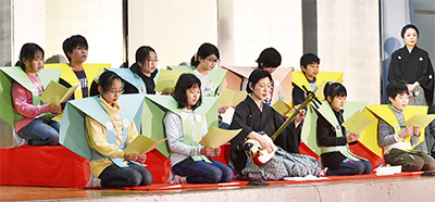 文化庁の事業で、小・中学校等に芸術家を派遣し、子どもたちの発想力などの育成につなげることが目的。川上小には一般社団法人義太夫協会と八王子車人形西川古柳座が来校した。10日にワークショップが、12日にプロの舞台鑑賞と5、6年生の代表児童による発表が行われた。代表児童が手作りの衣装をまとい、三味線に合わせ義太夫節を披露すると大きな拍手が沸き起こった=写真。