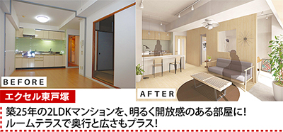 リノベーションの提案拠点(窓口)でもある同店は、デザイナーズリノベーションのモデルルームを誕生させた。「居住者の工夫でさまざまな表情をみせる部屋」にリノベーションした「エクセル東戸塚」は必見。BEFORE・AFTERの内覧会も開催中。問い合わせは気軽に「ようこそHamaJu」へ。