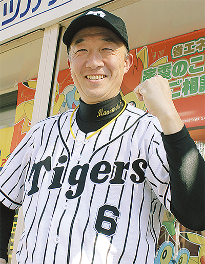 「トツカ家電」(上倉田町)の店主・福嶋宗樹さん(46)は、金本監督の物まね芸人としての一面も持つ。芸名はずばり「マネモト」。金本監督の就任が昨年10月に決まってからは、イベントやテレビ出演、取材の依頼が舞い込み、大忙しの日々だ。