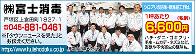 戸塚区で40年、害虫の予防や駆除を専門とする富士消毒では、全ての施工スタッフが白蟻防除施工士のライセンスを取得している。薬剤は臭いが少なく、人や環境に配慮したものを使用するため、子どもやペットがいる家庭からの依頼も多い。施工後5年間の保証付き。3年目と5年目(保証満了時)には無料点検も行うなど、アフターサービスも充実している。