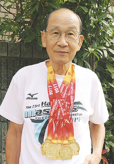 練習場所はもっぱら、自宅近くの市児童遊園地。短距離走を中心に汗を流す。幅跳びや高跳びの練習環境がないため「本番がそのまま練習となる」と思い、全国各地の大会に年15回程度のペースで出場。60代半ばで記録のピークを迎え、70代半ばまで保ち続けると、自然に優勝回数が増えていったという。