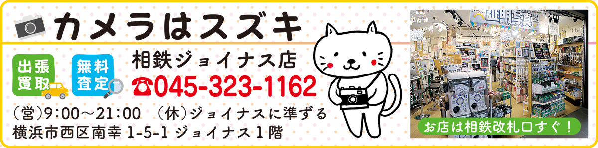 横浜西口ジョイナス1階にある「カメラはスズキ」では、中古カメラの買取を行っており、専門店ならではの”高価買取”に絶対の自信を持つ。「当店では、他で『ほとんど値段が付かない』と言われたカメラを高値で買い取った例が多数あります」と担当の鈴木健士さん。業界の相場を把握する経験値の高い専門スタッフが対応するため、カメラの正しい価値が分かった上で査定金額が付けられるのだという。