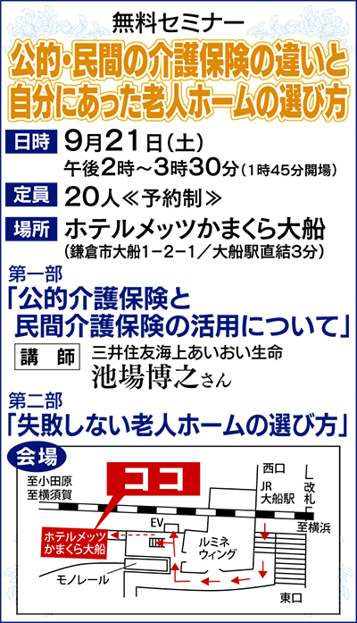 公的介護保険と民間介護保険の違いと、老人ホームの選び方について学ぶセミナー「公的介護保険と民間介護保険の活用について」と「失敗しない老人ホームの選び方」が9月21日(土)、ホテルメッツかまくら大船(鎌倉市大船1の2の1)の会議室で開催される。時間は、午後2時から3時30分(1時45分開場)。
