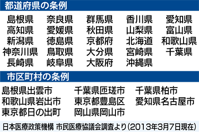 がん対策条例は神奈川県を含め全国24道府県、8市区町で制定されている(13年3月現在)。それぞれが行政・保健医療従事者・市民の責務や、在宅医療・緩和ケアの推進などを定めている。